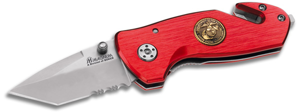 This knife is dedicated to one of the most elite military units in the world - the U.S. Marines. This compact rescue knife features a red aluminum handle, which boasts the famous logo. The modified tanto style blade is partially serrated, and crafted of 440 stainless steel. To complete the package, this sturdy piece also features a seatbelt cutter and glassbreaker for rescue situations. Includes pocket clip. Blade length: 2 3/8". Overall length: 6". Weight: 3.2 oz.