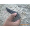 "Aunque he tenido mas de un accidente debido al``shaving sharp´´, es la punta donde este arma acumula mayor fuerza. Una estocada descendente de este objeto basta para que se clave hasta en la madera lo que se ve en la foto. La forma del mango que asegura el indice y pulgar permite que no se deslice la mano hacia el filo ademas de permitir un agarre comodisimo tanto en el agarre normal como en el inverso."
