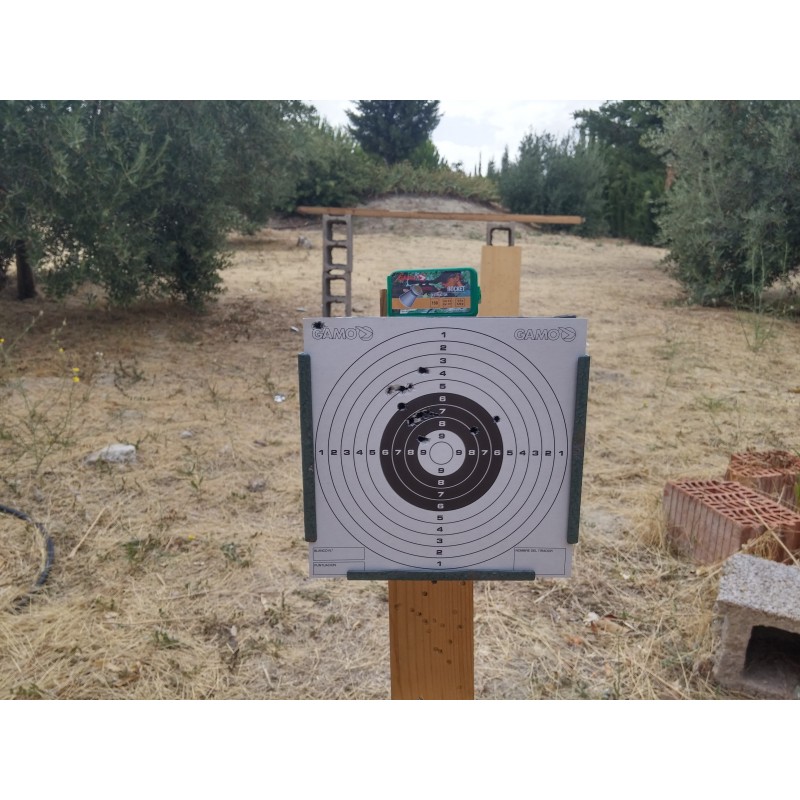 "estos disparos están realizados con una carabina gamo wisper x con un Diábolo rocket a una distancia de 10 metros."