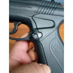 "Como se puede ver en la foto al apretar el botón de expulsión del cargador de la Crosman C-11 no sale despedido , solo sale lo que se ve en la foto, hay que tirar de el hacia abajo."