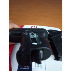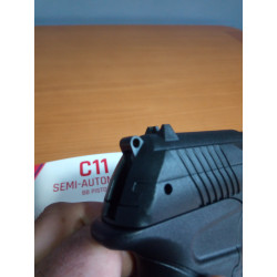 "Como se puede ver en la foto la Crosman C-11 es pequeña y ligera toda de polímero, por poco no coge entera en la palma de una mano, pistola sencilla para precio super asequible."