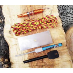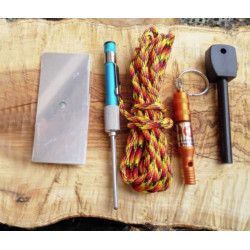 "El afilador de diamente y el silbato son los complementos que mantengo en el kit, el espejo de señales no lo voy a usar nunca y para pedernal, llevo un mechero en una bolsita de plástico y me es mas práctico"