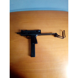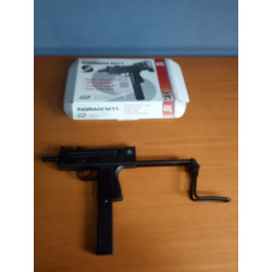 "Vista general del subfusil ASG Cobray Ingram M11 CO2 con el culatin desplegado totalmente, tiene dos posiciones en esta se puede apoyar el culatin en el hombro aunque no se encara demasiado bien por sus dimensiones que son algo pequeñas. "