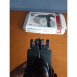"Vista general del alza del subfusil ASG Cobray Ingram M11 , como se puede ver es de plástico, pero algo endeble,el agujero es grande para encarar más rápidamente el objetivo de puede ver al fondo el punto de mira."