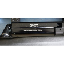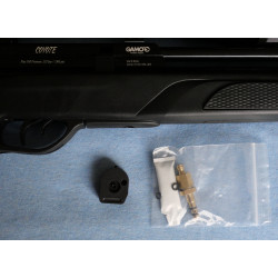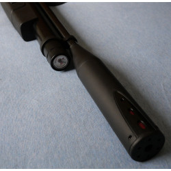 "Detalle del moderador de sonido incorporado al cañon del arma y de la posición del manómetro que nos indica la presión del depósito de la carabina, su capacidad de carga esta dentro de la media"