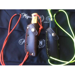 "Aparte de poder llevar el cuchillo en el cinturón,este pequeño cuchillo puede llevarse en el cuello,usando un paracord pasándolo por el agujero pasador que trae la funda"