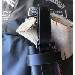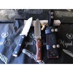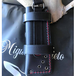"La funda de cuero es muy buena, sin muchas florituras de llevar piedra de afilar ni nada, el cuchillo con su porte vertical u horizontal. Tiene varios agujeros ollados para pasar cuerda y atarlo a la pierna"