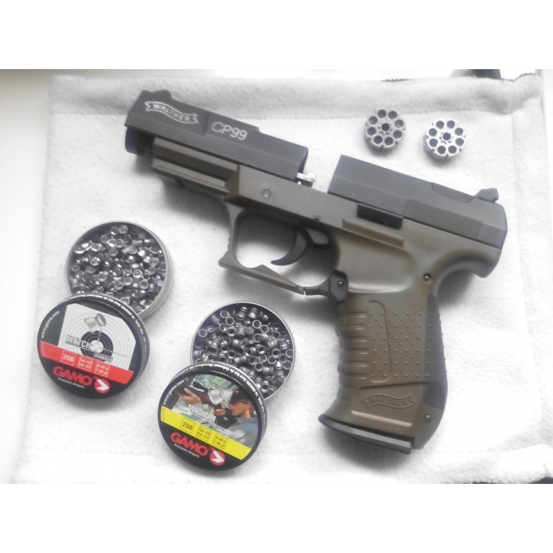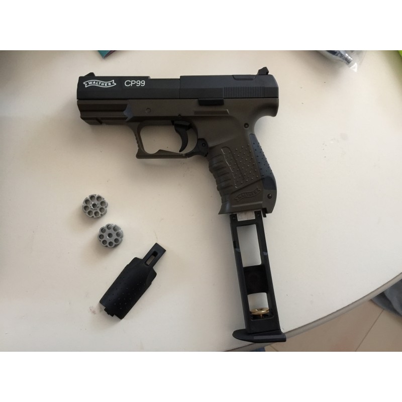 "En esta foto aparece la walther cp99 militar y junto con los cargadores y dos latas de balines para el tiro de precisión y larga distancia. Recomiendo la compra de la pistola no solo por su precisión sino porque al no tener el retroceso blowback gasta menos co2 que otras como por ejemplo la gamo pt85. Con las bombonas de leoppard he llegado a disparar 60 tiros."