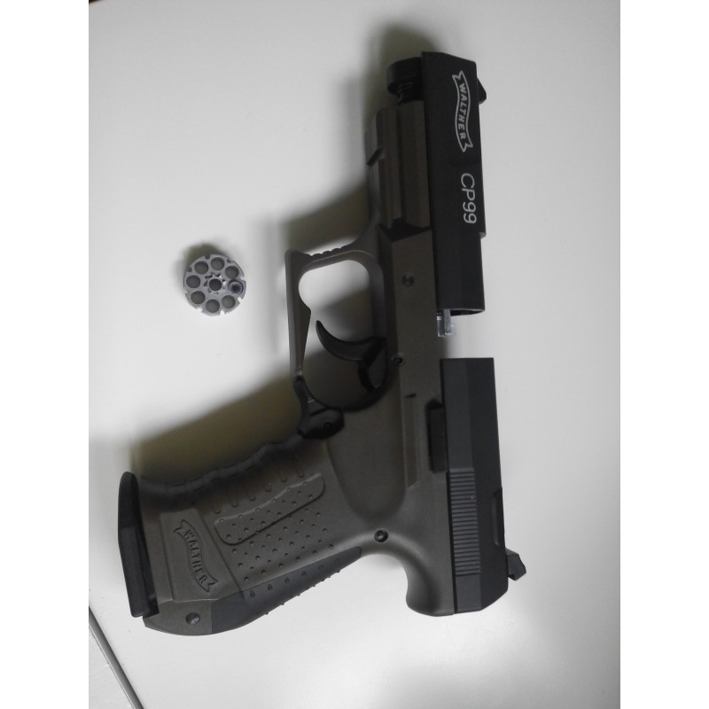 "en esta imagen podemos ver donde se coloca el cargador rotatorio de 8 balines en la Walther CP 99 de CO2. cabe destacar que es semiautomática."