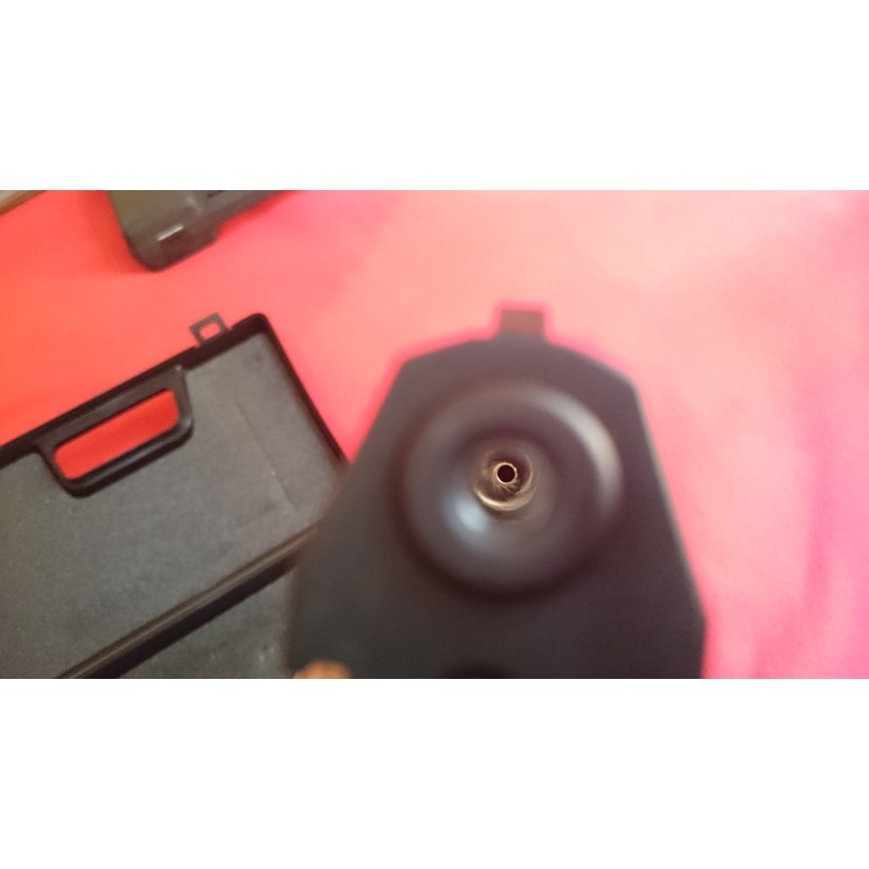 "Foto de la pistola por el percutor abierto para cargarla,los cargadores que vienen con la pistola también la carga del co2 ya montada."