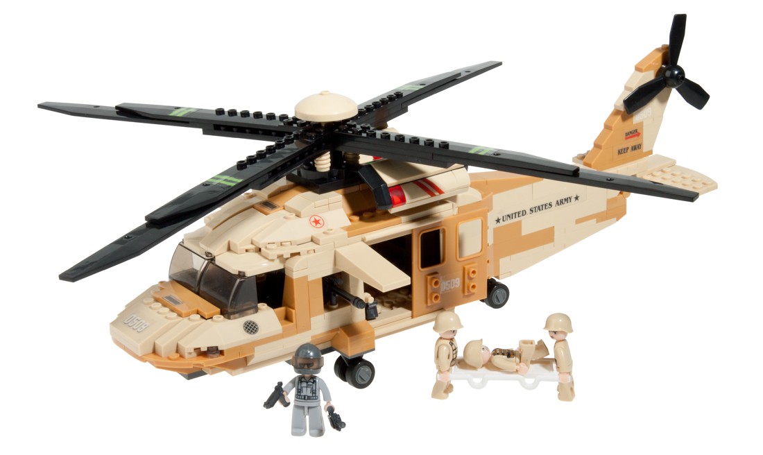 La escena se compone de un helicóptero en color camuflaje, con un acabado al detalle que incluye cristaleras delanteras, puerta corredera, armas pesadas y hélices delanteras y traseras. Así mismo, el juguete está compuesto por un piloto militar con casco, y por tres soldados con una camilla de heridos.