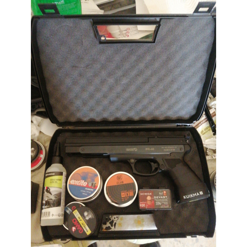 "Viene con el maletin y una lata de 250 plomos Gamo Pistol Cup(no son los más adecuados para este arma). Pero el maletin es un detalle que se agradece. Tras el acolchado puedes poner la documentación. Algo que también se agradece si acostumbras a ir al campo de tiro ya que nunca olvidarás la documentación. "