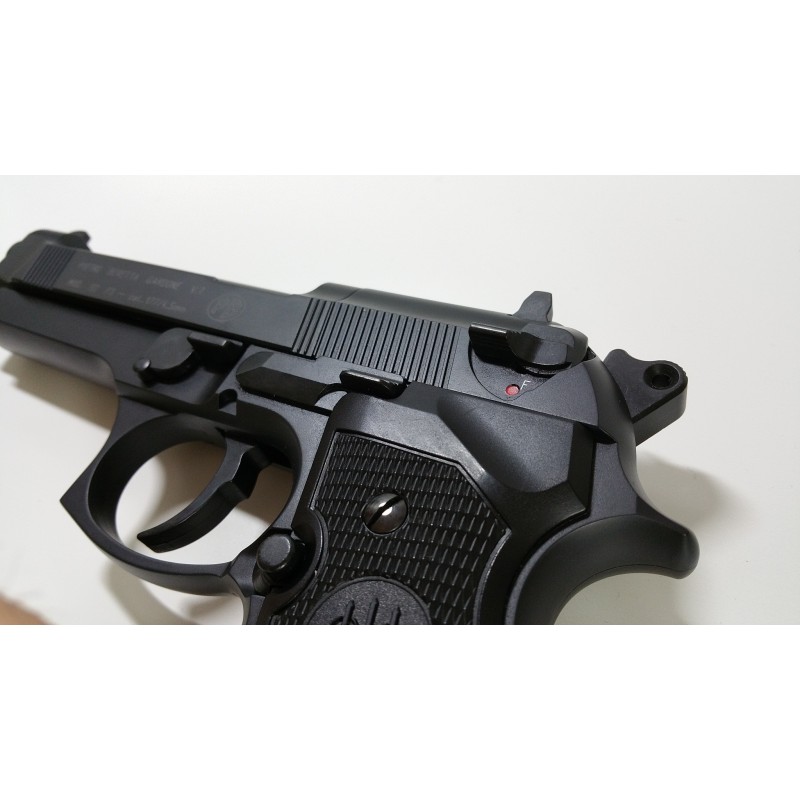 El seguro se acciona con la patilla metálica de la parte posterior, en otras versiones de M92 es de plástico y se puede romper fácil, en este es metálico y muy robusto