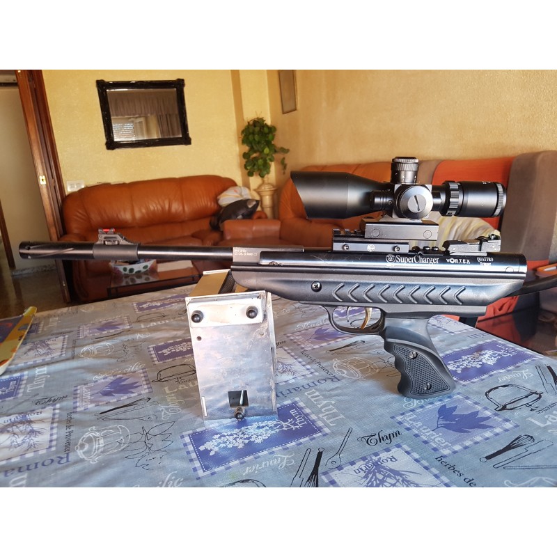 "Ideal para pasar un buen rato "lateando". La compré en calibre 5,5 y me ha sorprendido la potencia que tiene. No pretendas hacer Dieces a 15 metros pero si divertirte tirando a las latas de cerveza y melocotón a 15 y 20 metros . El prolongador más larga resulta muy útil a la hora de recargar pues si bien es cierto que está un pelín duro pero nada fuera de lo normal. En general es divertida, potente y de calidad media"