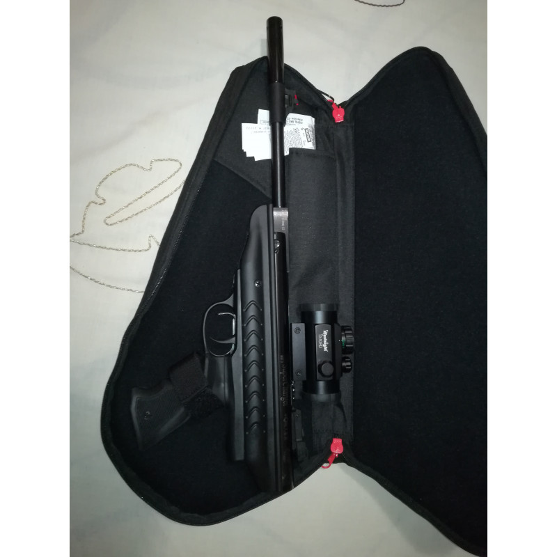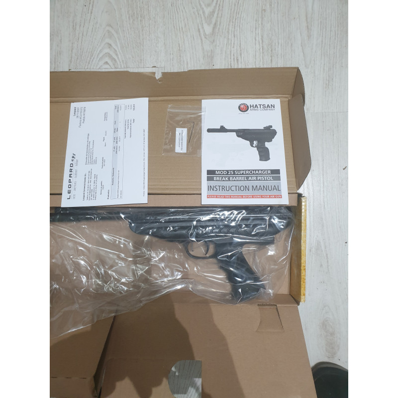 "La Hatsan M25 muy buena pistola(el supresor , que en realidad es para amartillarla ) podría ser de acero en vez de aluminio , con una sesión de tiro la rosca tiene un juego que no se cuanto aguantará . Es casi una carabina. La atención en Leopard como siempre"