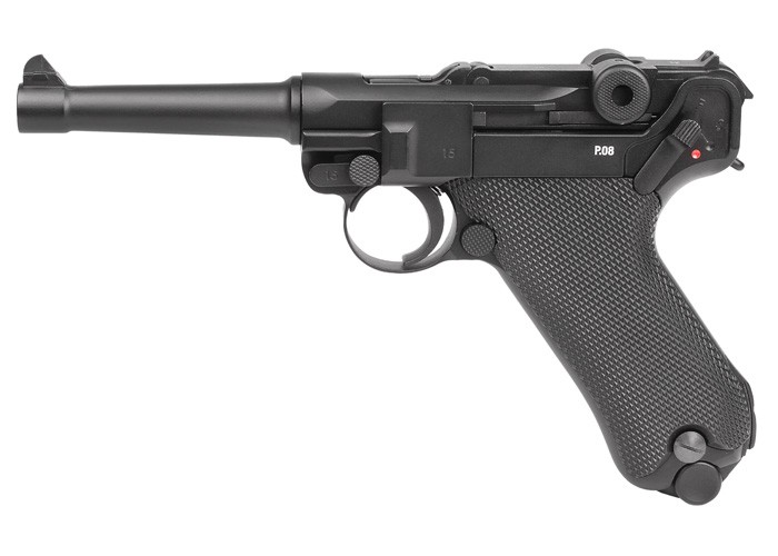 La principal característica de la P08 desarrollada por Legends, es que la pistola está recubierta de Full Metal por lo que su peso de 816 gramos y tamaño se parece a la original. La culata con empuñadura picada permite un mejor agarre del arma.
