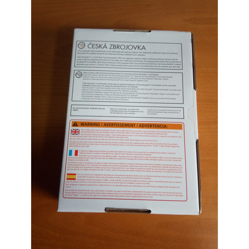 "Otro de los laterales de la caja original de la ASG CZ SP-01 SHADOW NO BLOWBACK,lo dicho anteriormente en perfecto estado sin deformaciones arrugas o desperfecto alguno, gracias a Leopard y Envialia."