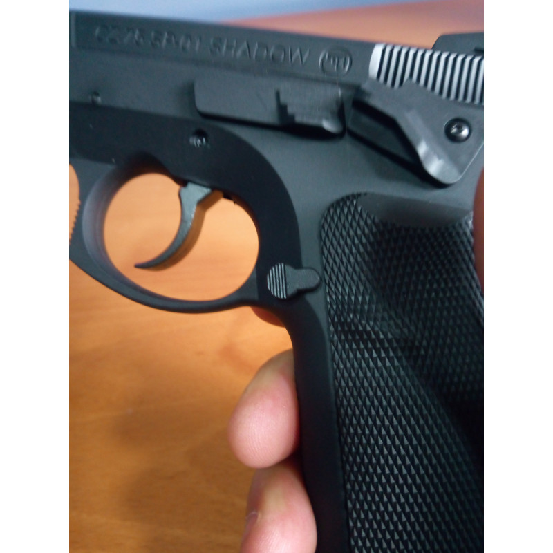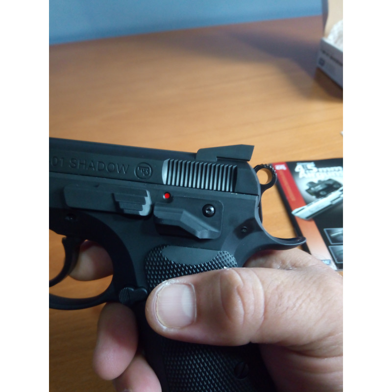 "Vista general del seguro de la ASG CZ SP-01 SHADOW NO BLOWBACK CO2, es cómodo y de fácil manejo, aquí se puede ver en posición de fuego, para mí gusto el seguro está muy bien ."