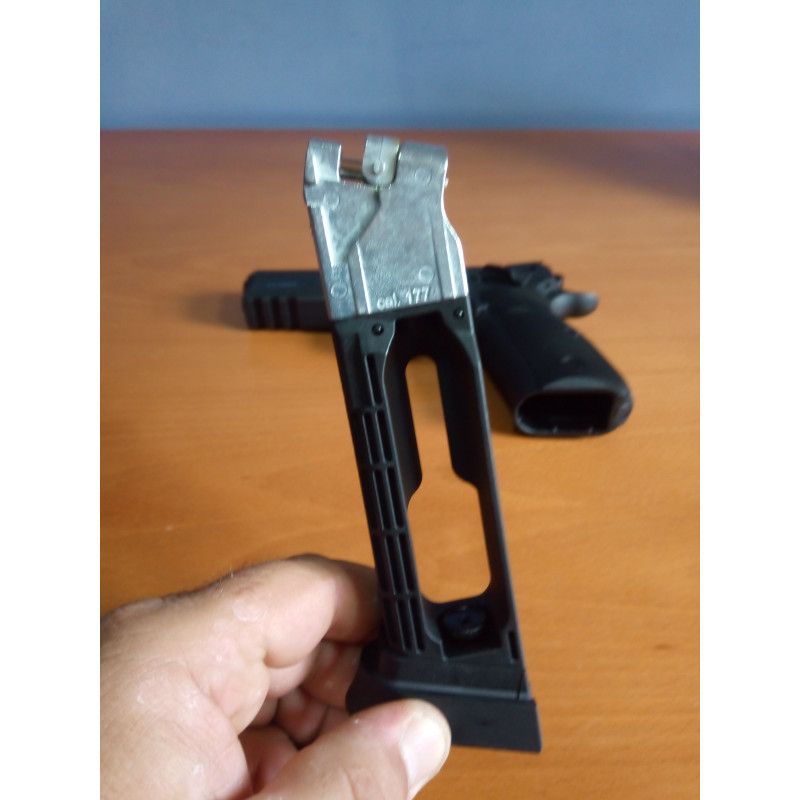 "Como se puede ver el cargador está bien fabricado, el compartimento de la cápsula de CO2 va integrada en el cargador lo cual con la capacidad de 21BB's de acero le da un peso mucho más real al armá a la hora de apuntar y disparar . El calibre es de 177 o 4'5 mm."