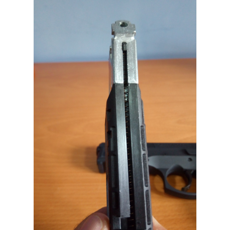 "Como dije anteriormente al apretar el botón de expulsión el cargador no sale expulsado de la empuñadura como se ve en la foto ,si no que hay que tirar del cargador hacia abajo para poder sacarlo."