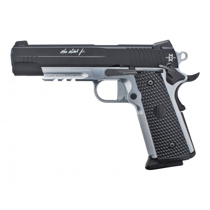 El acabado de la Sig Sauer 1911 Max Michel es en color plateado metal y negro mate. Así mismo, lleva serigrafiada la firma y el logo de Max Michel.