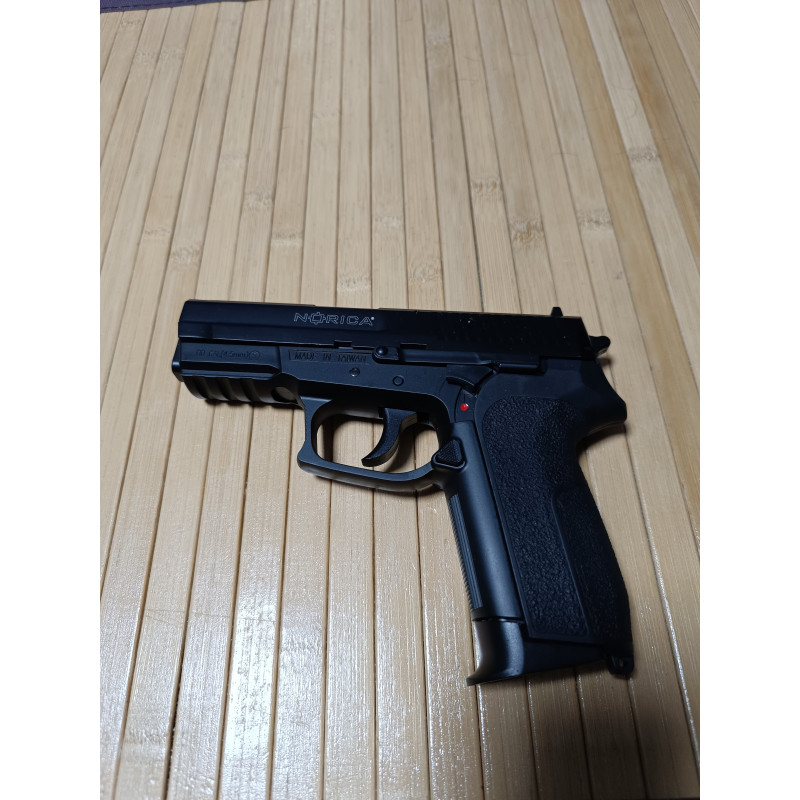 "Imagen de la parte derecha de la réplica, salvo por los marcajes de Norica, parece la sig Sauer SP 2022 a la que simula, aunque por esta parte parte se ve el gatillo hueco y se nota que es de plástico, por lo demás es brutal."