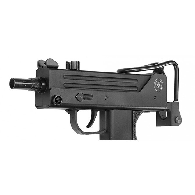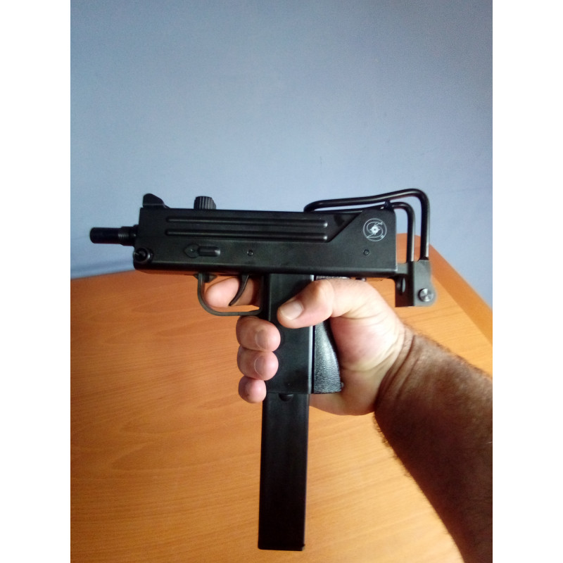 "Vista general del subfusil ASG Cobray Ingram M11 CO2 con el culatin desplegado totalmente, tiene dos posiciones en esta se puede apoyar el culatin en el hombro aunque no se encara demasiado bien por sus dimensiones que son algo pequeñas. "