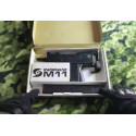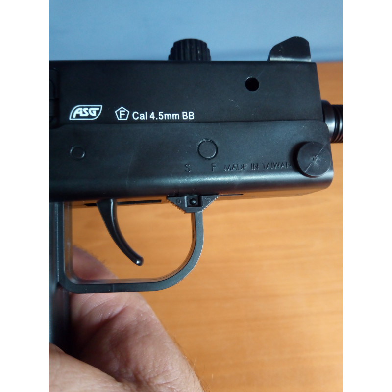 "Vista general del gatillo y el seguro del subfusil ASG Cobray Ingram M11 CO2,como se puede ver el seguro está delante del gatillo es muy fácil de manipular sin necesidad de utilizar la otra mano,con la qué empuñas lo mueves sin problema."