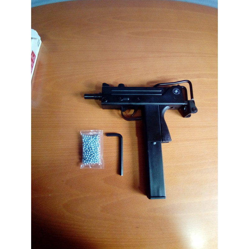 " Vista general del subfusil ASG Cobray Ingram M11 CO2 con su cargador montado, viene con llave Allen para el tapón del compartimento de la cápsula de CO2 y una bolsita de aproximadamente 100 BBS para poder probar la réplica aunque no traé cápsula de CO2, por el precio que tiene no puedes pedirle más."