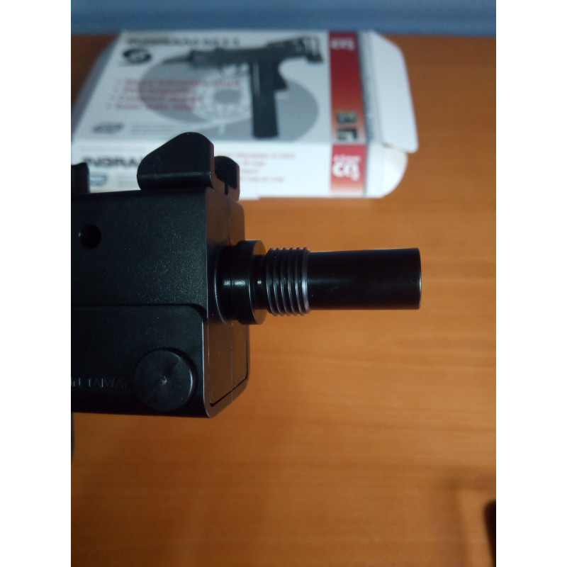 "Vista general de la bocacha del subfusil ASG Cobray Ingram M11 CO2, como se puede apreciar la bocacha es plástica y parece poco consistente habrá que ver si aguanta el paso del tiempo y el desgaste del usó."