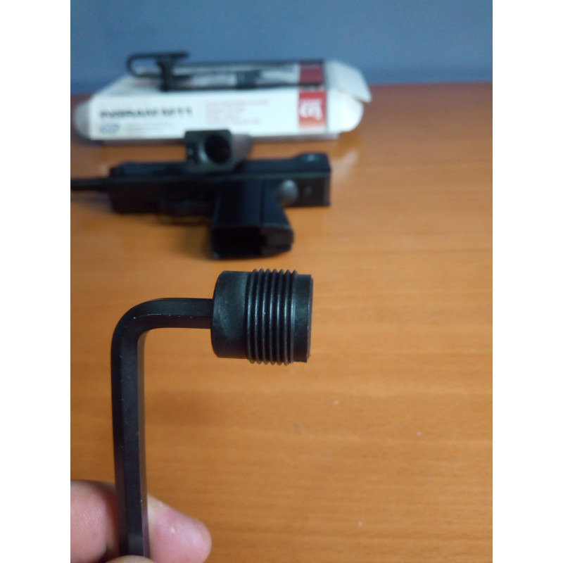 "Vista general del tapón roscado del compartimento para la cápsula de CO2, mucho cuidado al apretar el tapón , pues al ser de plástico puede pasarse de rosca con facilidad y la llave Allen puede comerse la forma hexagonal del tapón al apretar muy fuerte,al igual que al aflojar."