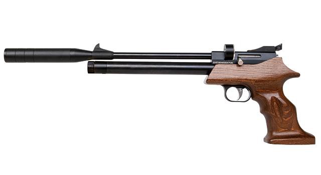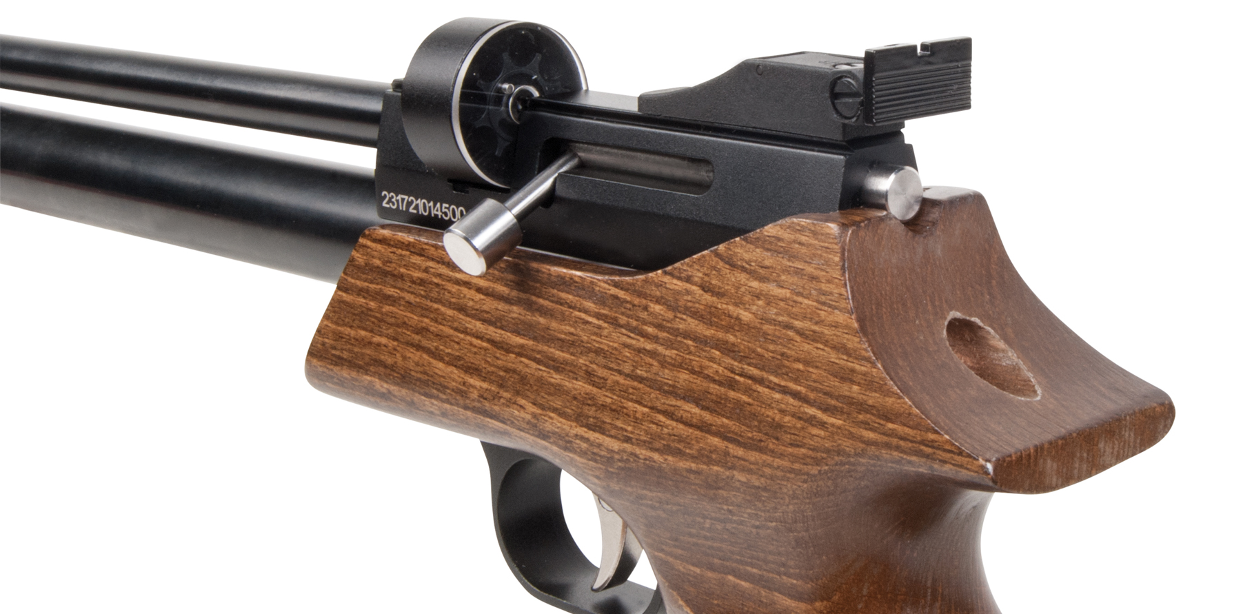 Esta pistola PCP viene equipada con una empuñadura ergonómica fabricada en madera de nogal.