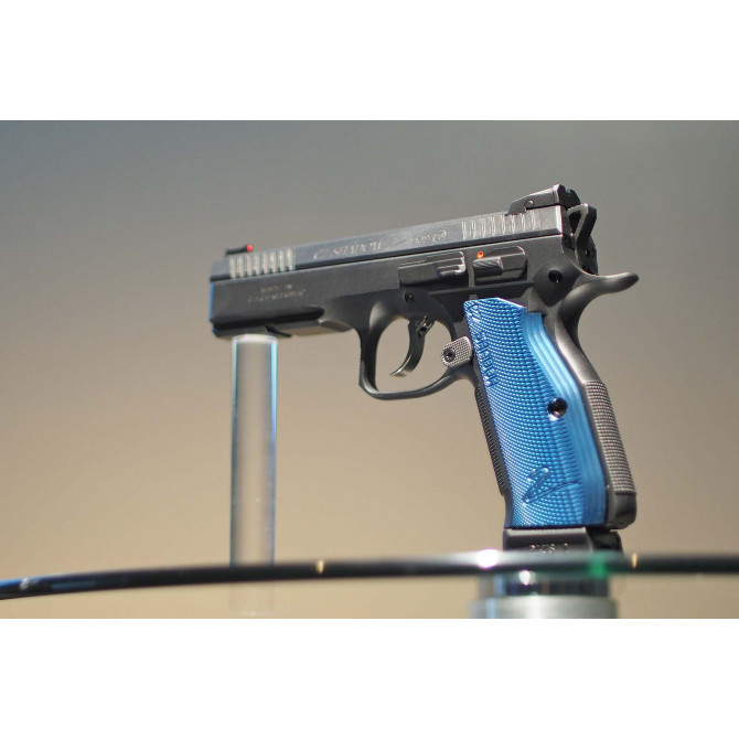 El fabricante de la República Checa CZ, fundada en 1936, ha diseñado una estructura ergonómica para mejorar el agarre del arma y reducir la fatiga en sesiones largas de tiro. En la empuñadura está recubierta con fibra termo-plástica de color azul, para aumentar el agarre de la pistola y la precisión del disparo.
