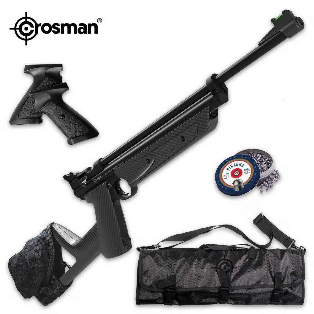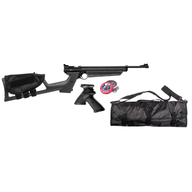 Crosman presenta este nuevo kit con una pistola monotiro, con sistema de carga manual mediante bombeo y capaz de alcanzar los 170 m/s de velocidad. Además, incorpora cañón de acero estriado, mira trasera regulable y delantera de fibra óptica. El cuerpo está fabricado en fibra de carbono. Incluye cerrojo de acción simple para carga rápida y culata removible para acoplar empuñadura de pistola.