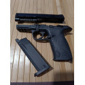 "Arma con el cargador desmontado que aloja 15 bolas de acero del calibre 4'5mm y 177 gramos, es capaz de disparar el cargador entero todo lo rápido que puedas mover tu dedo, cuenta con seguro manual ambidiestro y seguro de gatillo exactamente igual que el arma de 9mm original, fenomenal producto."