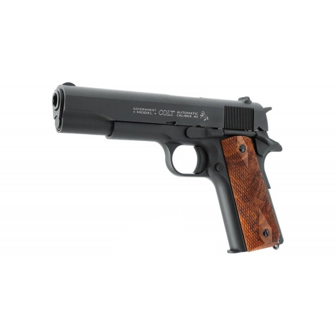 Colt nos ofrece otra versión nueva de la mítica pistola Colt 1911 Classic. En este caso es una réplica accionada con bombonas de Co2 de 12 gramos y con una potencia de 3 julios, por lo que nos da una velocidad de salida de 100 m/s. Con cada bombona puedes disparar aproximadamente unos 45 disparos. Dispara bolas de acero BBs y tiene un cargador con una capacidad para 17 bolas. Incluye corredera blowback.