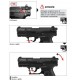 Este modelo de pistola detonadora está fabricada en metal y fibra sintética de alta calidad. La corredera está diseñada en níquel. Incorpora un cargador metálico con capacidad para 7 cartuchos de fogueo, así como un gatillo de simple y de doble acción. En este sentido, la pistola ofrece las mismas características de manejo y operación que la pistola original.
