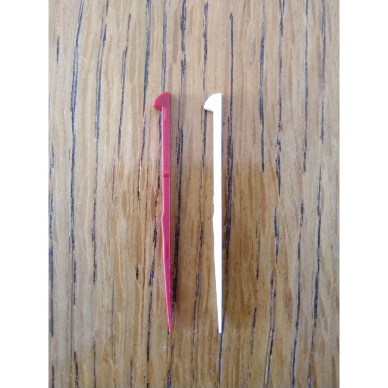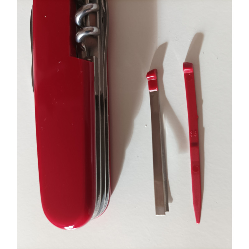 "Palillo nuevo (rojo) comparado con el que vino con mi Victorinox Ranger (marfil). El nuevo palillo parece tener una mayor curvatura, pero tal vez sea porque el palillo original lleva años dentro de la ranura del Victorinox."