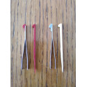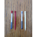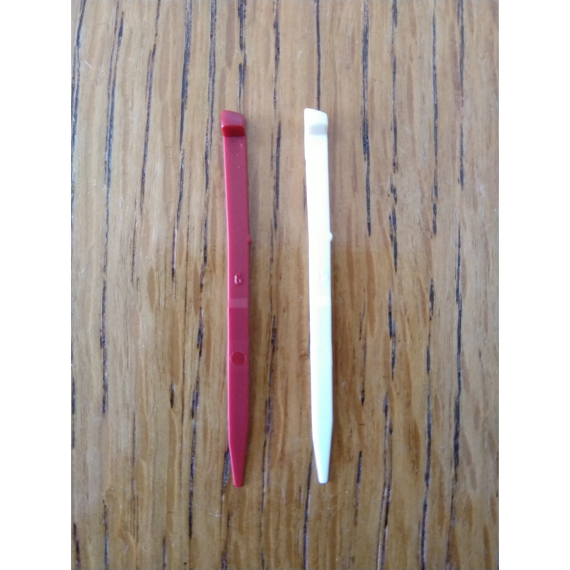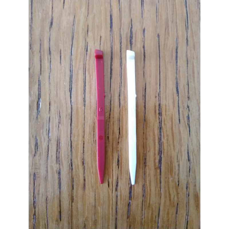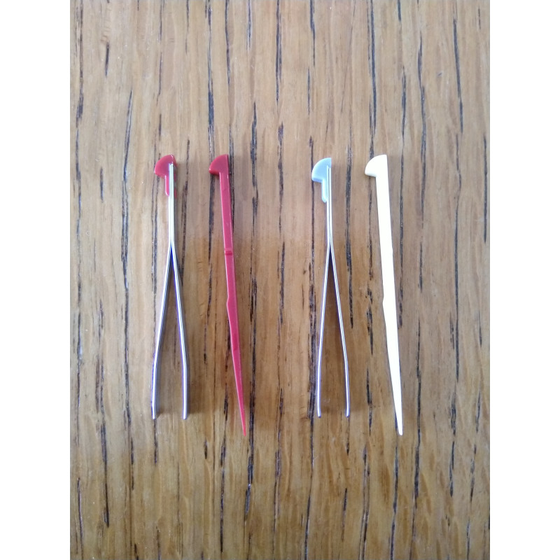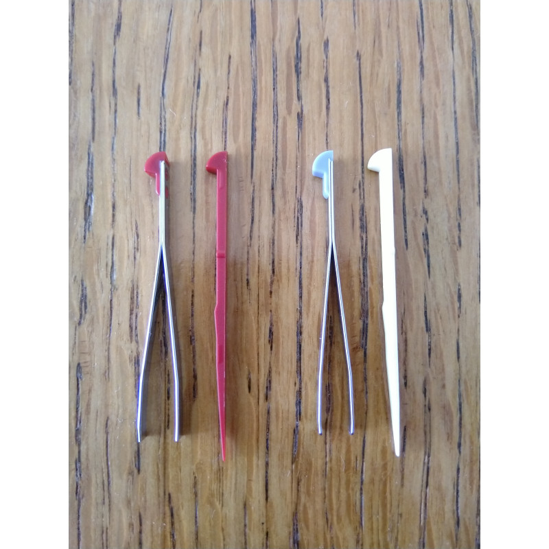 "Vista lateral del set de pinzas y palillo rojos, comparado con el set original (pinzas grises y palillo color marfil)."