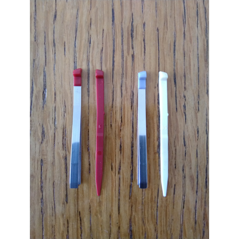 "Vista lateral del nuevo set de palillo y pinzas rojos, comparado con el set original (palillo color marfil y pinzas grises)."