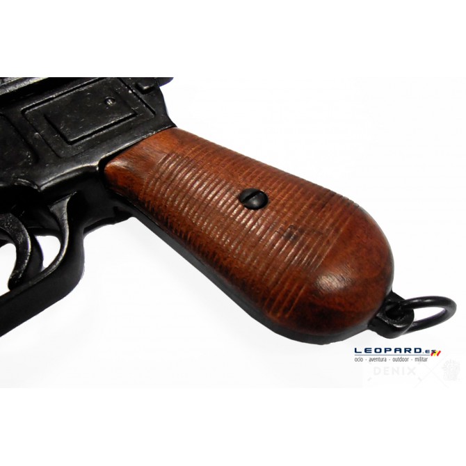 El cargador del arma Mauser C96 disponía de una capacidad para 10 cartuchos en un sistema de carga semiautomático, y la empuñadura de la pistola estaba fabricada en madera de roble, mismo material que esta réplica de arma antigua. El diseño se atribuye a Peter Paul Mauser y su apelativo más famoso es ''Broomhandle''.