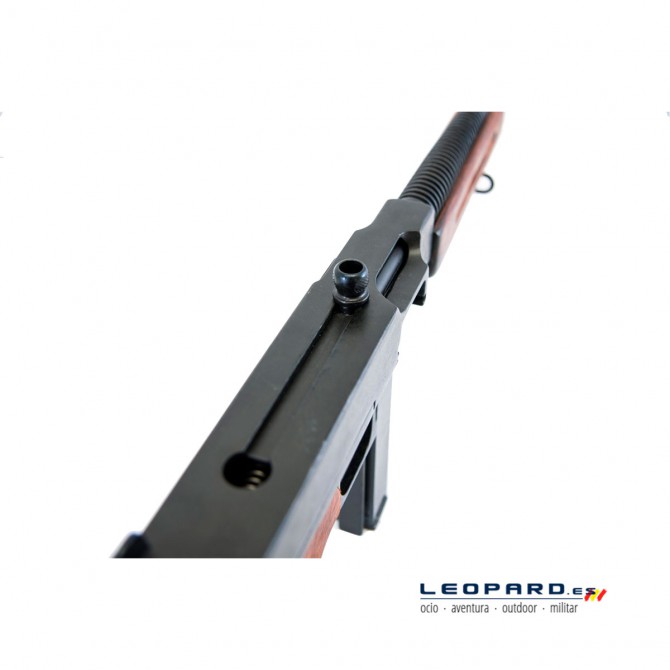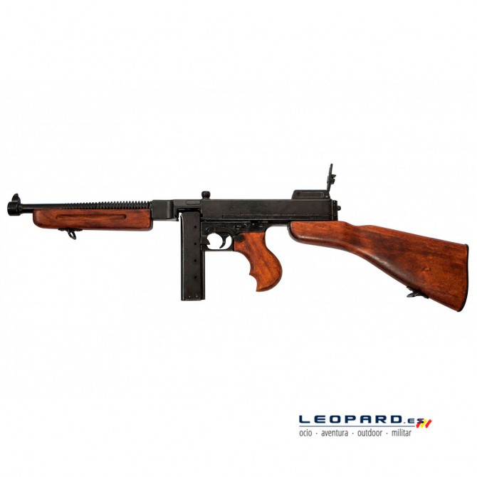 Esta réplica ha sido fabricada con materiales de primera categoría, de ahí que la estructura externa esté elaborada en madera y las partes internas de metal inoxidable. La Ametralladora Thompson M1 se acciona a través de un cerrojo situado en la zona superior del subfusil, también incorporado en esta réplica oficial.
