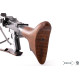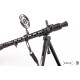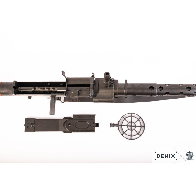 Imitación de ametralladora, fabricada en metal, madera y plástico, con mecanismo simulador de carga y disparo, bípode móvil y correa de piel.
