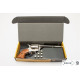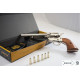 Caja de cartón con reproducción de revólver cal. 45 fabricado en metal y madera, con mecanismo simulador de carga y disparo, tambor giratorio y con 6 balas.