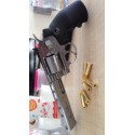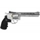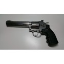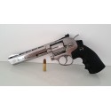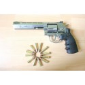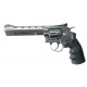 Revólver semiautomático de Aire comprimido por bombonas de CO2 de 12 gramos. Calibre: 4,5 mm Capacidad cargador: 6 bolas BBs. Tamaño: 6".Color plateado.