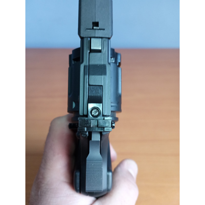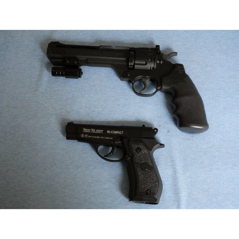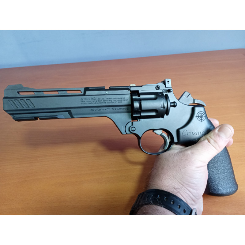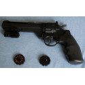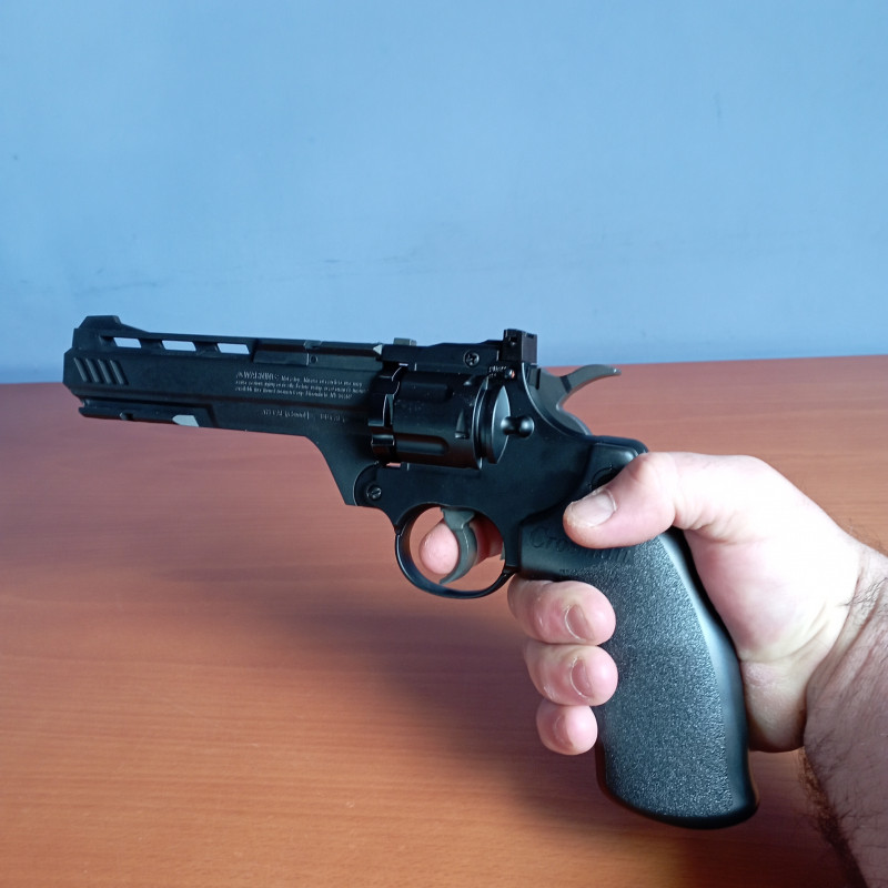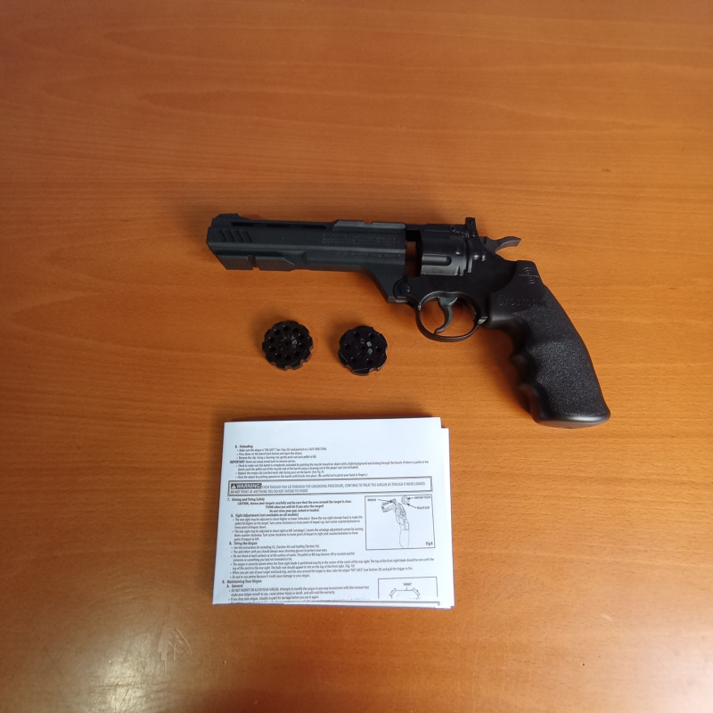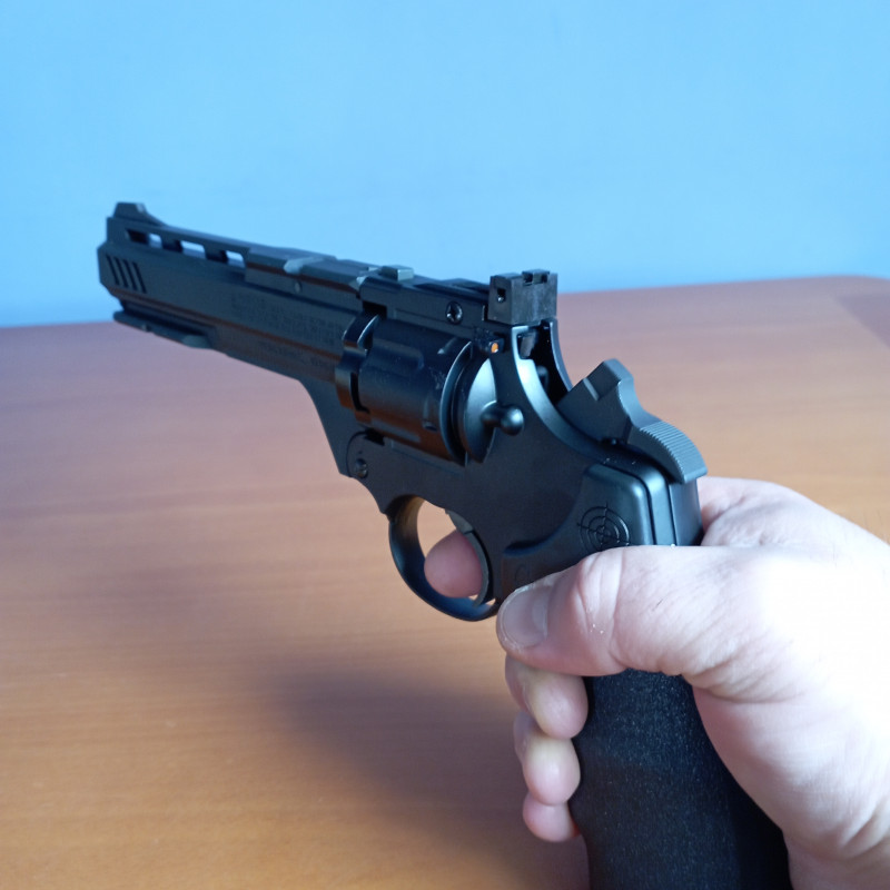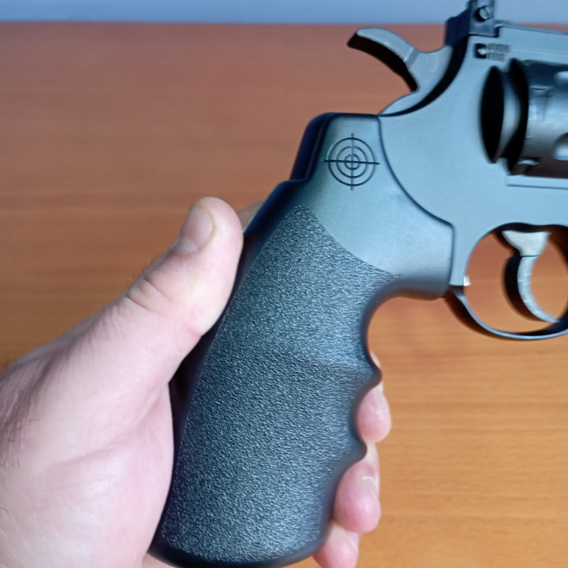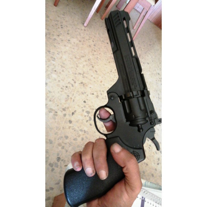 "Excelente revolver fabricado en parte en polímero, con peso contenido, preciso y con muy buena velocidad de salida, de los dos cargadores suministrados uno es para bolas bbs y el otro para balines"
