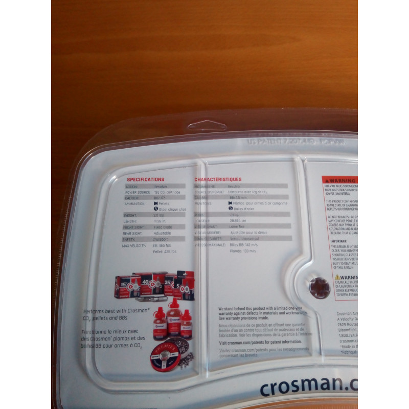 "Vista general del envoltorio original del revólver Crosman Vigilante CO2 4'5mm plomo, la típica carcasa plástica de la marca."