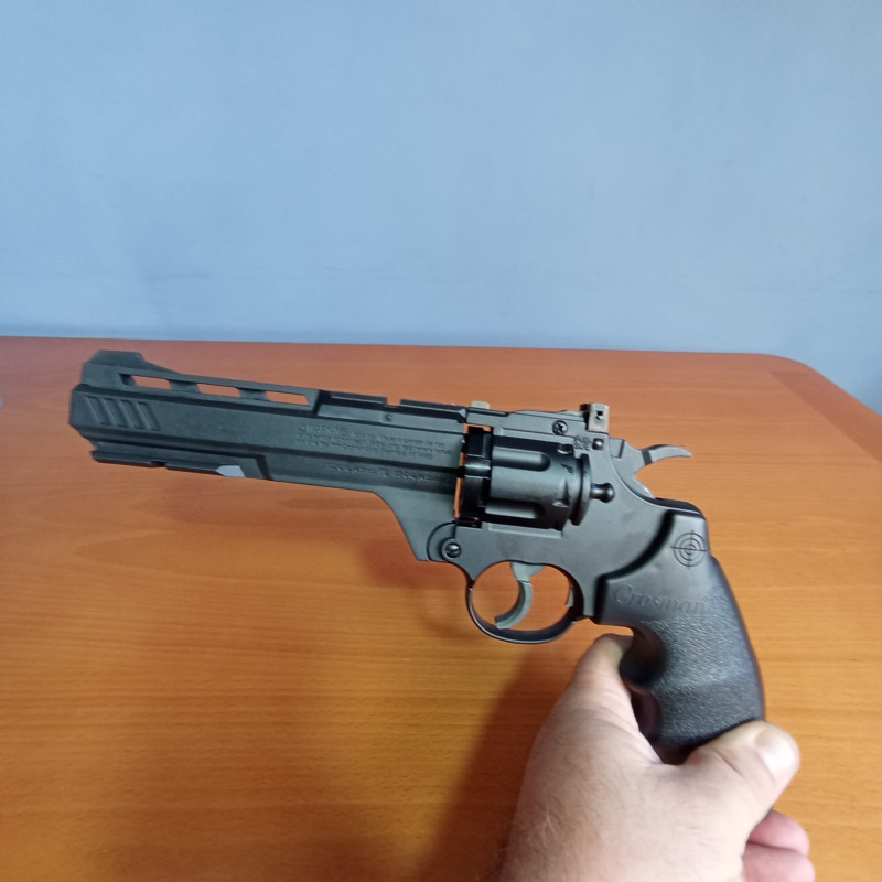 "El Crosman Vigilante CO2 ,con la cápsula puesta y listo para el uso, lo dicho anteriormente ,revólver tipo 357 largo Crosman Vigilante CO2 4,5 plomo, buen revólver de CO2 en relación calidad-precio."