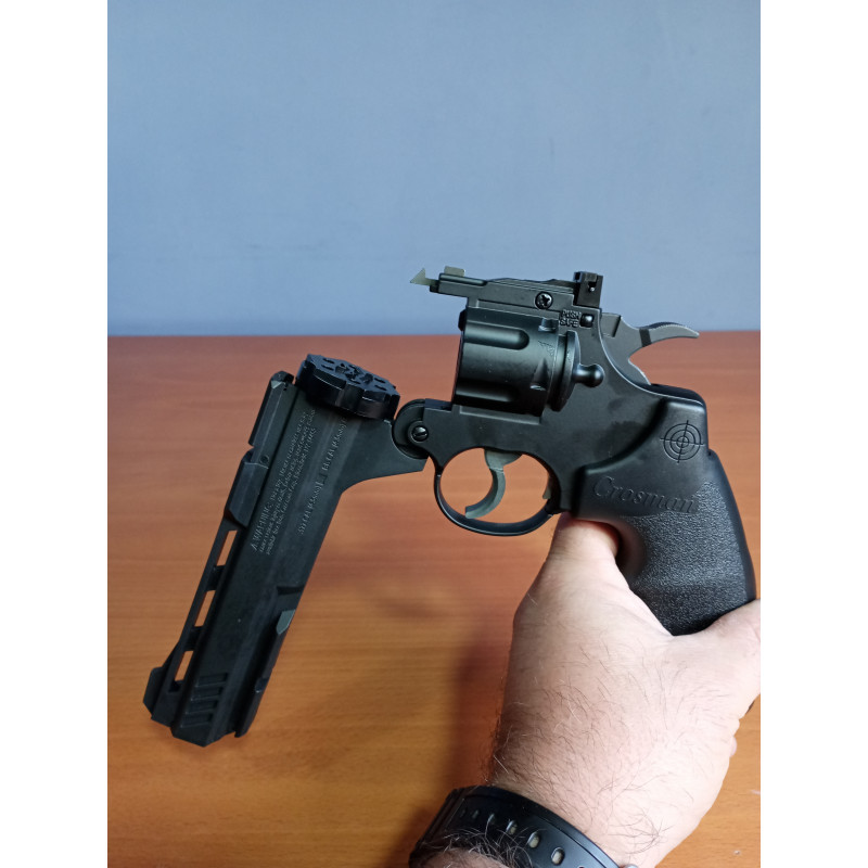 "Vista general del Crosman Vigilante abierto para cambio de cargadores, se puede ver que el cañón es abatible y tiene un manejo muy intuitivo."