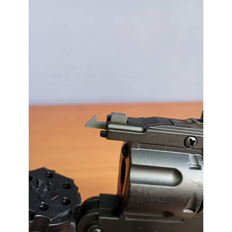 "Vista del punto de mira del Crosman Vigilante CO2 4'5mm plomo, como se puede ver el punto de mira esta fabricado en polímero como casi todo el revólver."